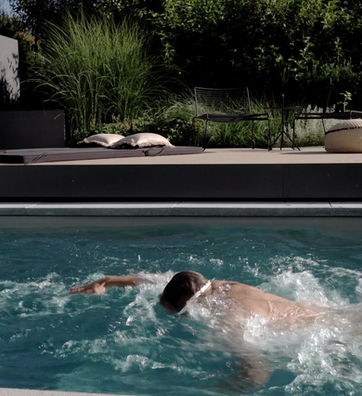Edelstahleinbauteile: Flachskimmer von Behnke für hohen Wasserstand, Einlaufdüsen, Bodenablauf